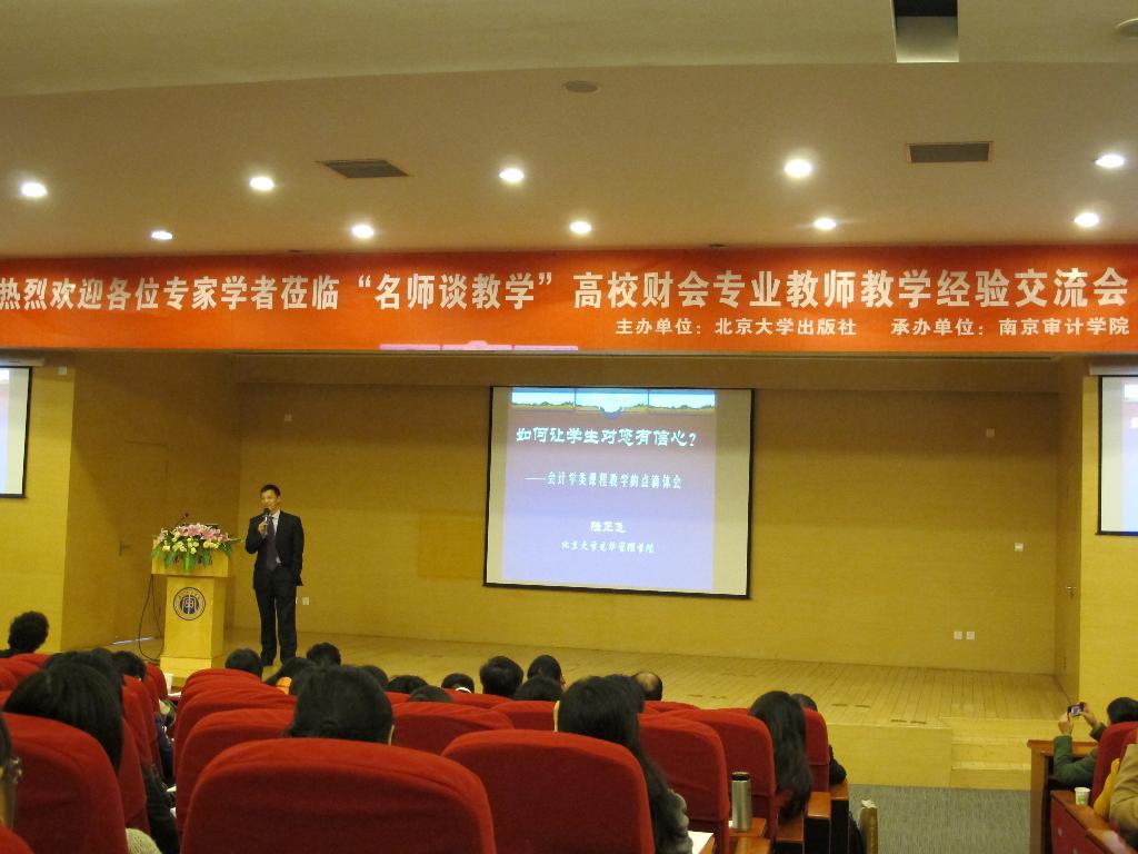 11月15日下午,在敏达一楼学术报告厅,我院与北京大学出版社联合主办了 “名师谈教学”高校财会专业教师教学经验交流会,时现副校长致开幕词,北京大学出版社林君秀主任主持会议,我院施平院长、黄溶冰副院长、殷俊明副院长、章之旺副院长出席了会议,参会的有来自全国各地财会专业30多所学校、100多位教师代表及我院全体教师。