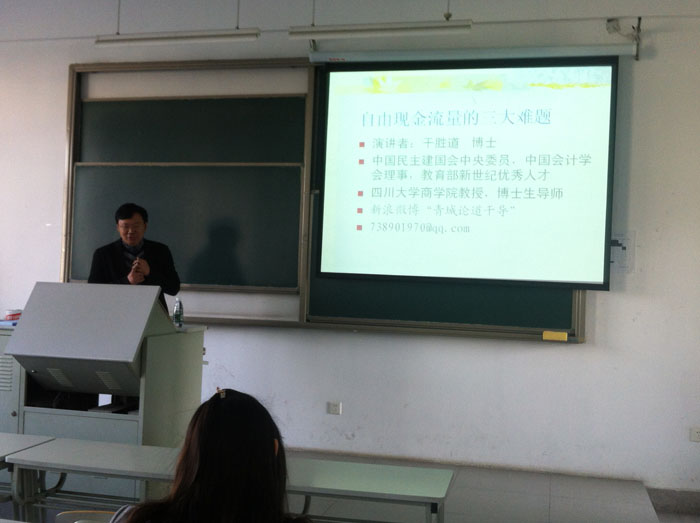 2014年11月13日下午,四川大学商学院博士导师、国内著名的财务学者干胜道教授,应我院邀请,对我院广大师生作了“自由现金流量的三大难题”学术讲座。自由现金流量是现代公司治理中的重要概念,是理解和解决代理问题的一把锁匙。干教授首先从人们日常生活入手,逐步引入对自由家庭自由现金流量、企业自由现金流量的理解,同时,大量引入中国上市公司案例,分析自由现金流量产生的原因、背景、形式及由此导致的中国式公司治理问题。最后针对自由现金流量的“定量难”、“代理成本区分难”和“约束难”等三大难问题,干教授提出了自主的见解主张。同时,结合本课题的研究,干教授还与我们分享了国家基金申报的选题、论证、团队构建等方面经验。
