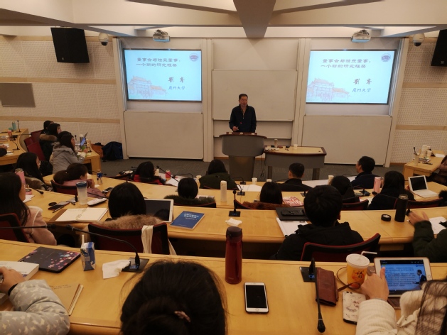 讲座伊始,刘峰教授给大家介绍了厦大的校园环境与文化,以此激励大家早睡早起,养成良好的习惯,并且要自信,热爱自己的专业。接着,刘教授讲解了他关于董事会与独立董事的研究。他指出当前此类问题研究都存在巨大局限,即研究者默认了董事会与独立董事的存在是合理的,但事实未必如此。刘教授表示董事制度由自愿发展为强制,制度则表现为经济有效或经济无效,他从演化经济学、管制经济学角度比较分析美英日等国独立董事的现状与我国的差异、原因与解释,以此来证实自己的观点,最终提出我国企业设立独立董事只是为了IPO需要。期间,刘教授一再强调做学问要保持一颗童真的心,善于发现,发现身边的事,发现有趣的问题,再去研究。研究方法也要去掉那些多余的技术性的东西,更注重思想而非花哨的技术外表,记住自己是为什么而出发,回到研究最初的目的。刘教授的讲述,旁征博引,穿插了画蛇添足、《侠客行》等故事,以及英国贵族的发展等史实;并结合恒安、辉山乳业做空等社会事件来给同学们解释理论、讲述道理,带着大家主动去思考问题,趣味性与教育性并存,给同学们带来了一场思想的盛宴。