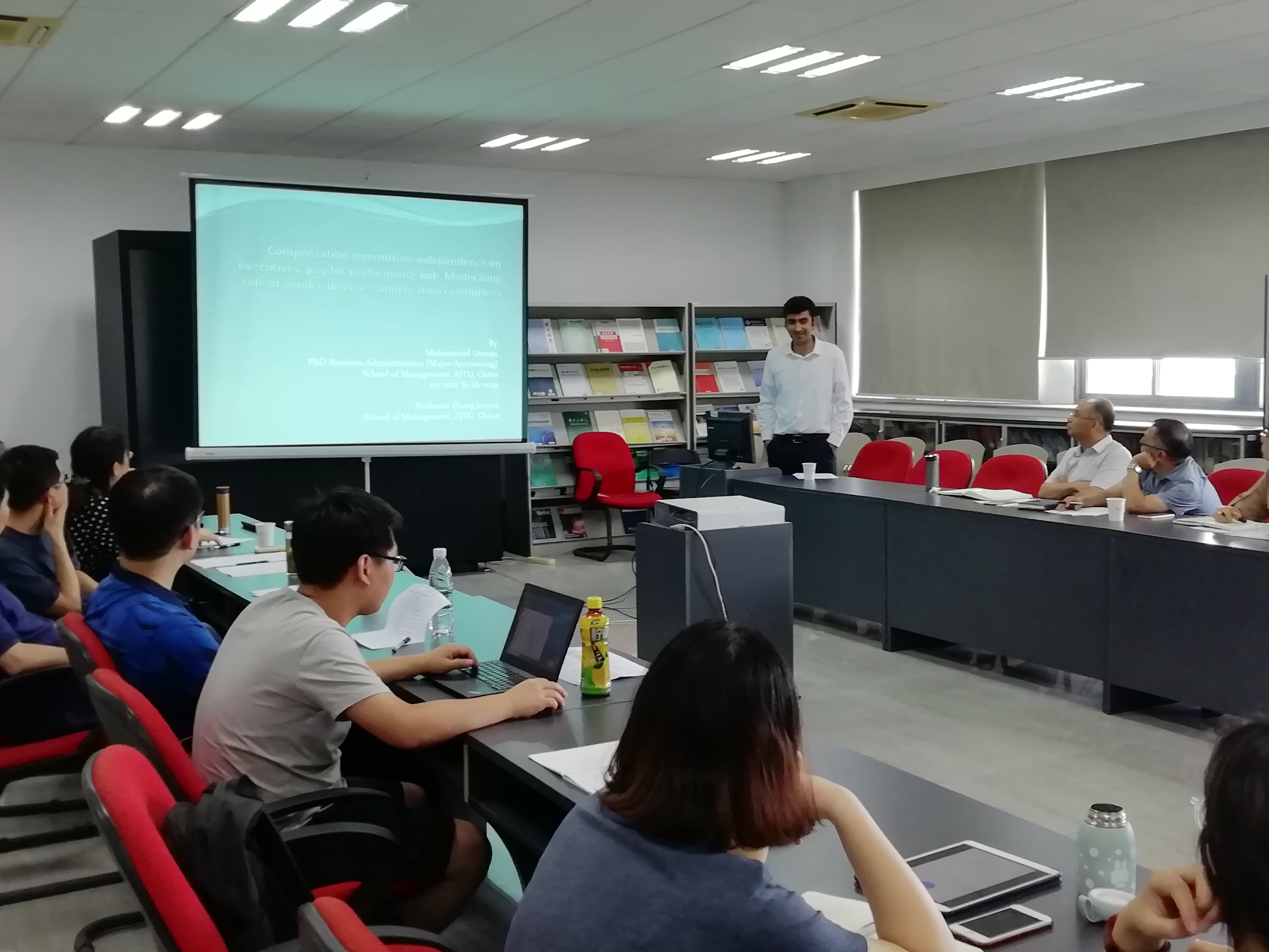 2019年6月24日下午,91视频 邀请西安交通大学乌斯曼博士在敏知516做《薪酬委员会对于高管薪酬绩效相关性的独立性:性别多元化的薪酬委员会的调节作用》的讲座,殷俊明院长主持了此次讲座。
