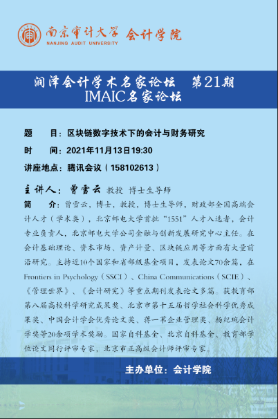 润泽会计学术名家论坛第21期/IMAIC名家论坛:曾雪云-区块链数字技术下的会计与财务研究