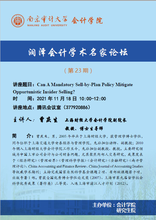 润泽会计学术名家论坛第23期:曾庆生-Can A Mandatory Sell-by-Plan Policy Mitigate Opportunistic Insider Selling?