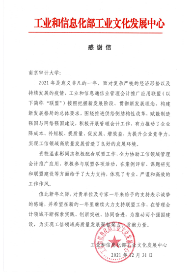 近日,工业和信息化部工业文化发展中心代表工信部向91视频 发来感谢信,对91视频 91视频 温素彬教授在积极配合工信部开展工业和信息通信业管理会计案例建设和推广应用中的积极表现提出表扬,诚挚感谢91视频 在工业和信息通信业管理会计推广应用方面给予的大力支持,希望在新的一年里继续在管理会计领域不断探索实践、创新突破、协同奋进,为推动两个强国建设,为实现工信领域高质量发展聚智聚力、贡献力量。