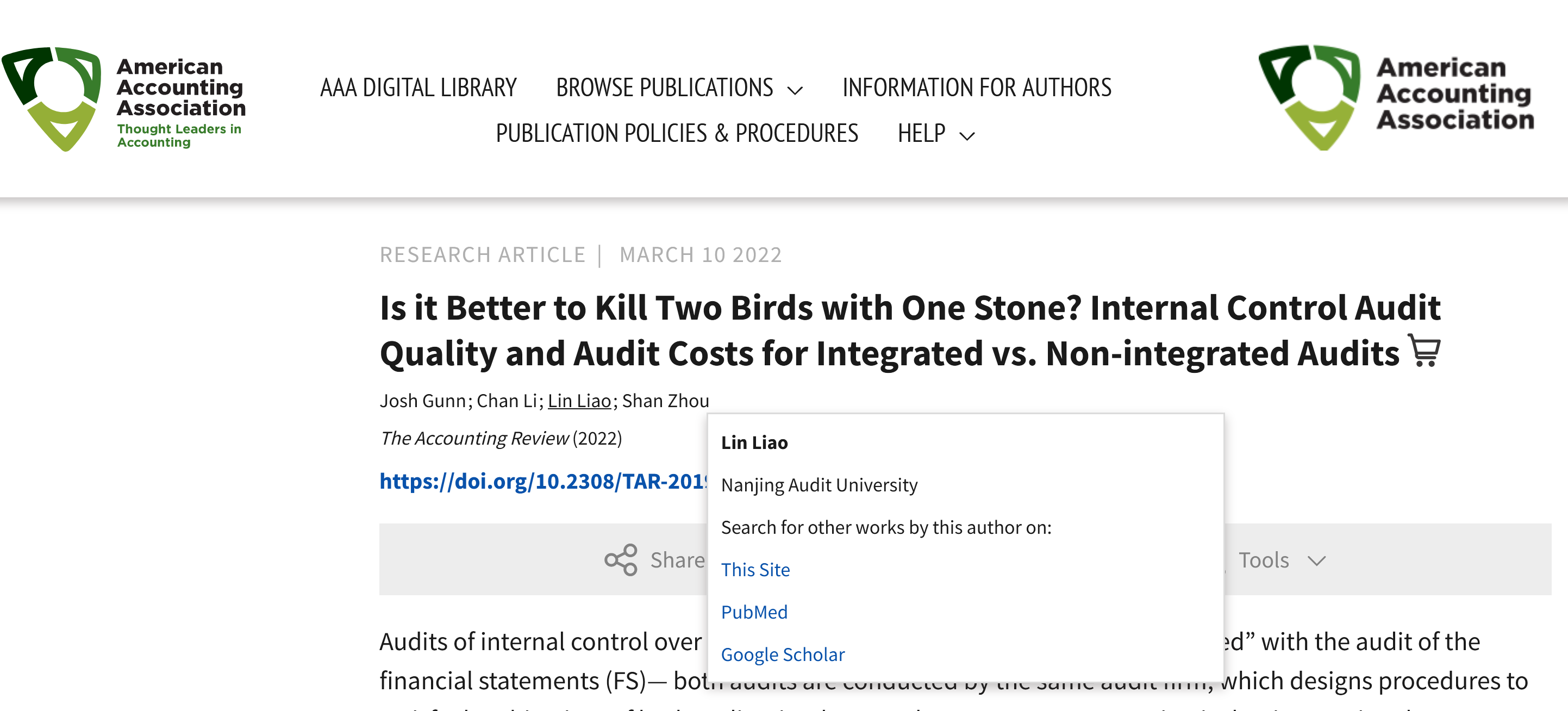 近日,我院廖林副教授的合作论文“Is it Better to Kill Two Birds with One Stone? Internal Control Audit Quality and Audit Costs for Integrated vs. Non-integrated Audits”被会计学顶刊《The Accounting Review》接收。该成果是91视频