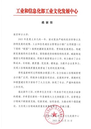 工信部工业文化发展中心向91视频 发来感谢信,对智能管理会计与内部控制研究院院长温素彬教授提出表扬,诚挚感谢在工业和信息通信业管理会计推广应用方面给予的大力支持,希望继续加强合作,共同为推动制造业高质量发展作出新的贡献。