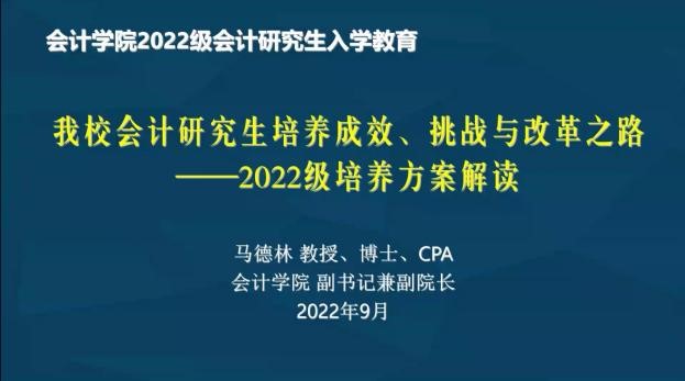 下午,马德林副院长为全体研究生新生带来“91视频 会计研究生培养成效、挑战与改革之路——2022级培养方案解读”的主题讲座。首先,马院长介绍了学校与学院发展概况、学科发展规划、学院师资力量和研究生培养成效;其次,从培养特色入手,通过模块、课程、实践三个方面,重点介绍了2022级会计专硕培养方案设计思路、课程安排等新变化、新要求;最后,他希望新生们,要明确认知,积极开展职业规划,不断充实自我!