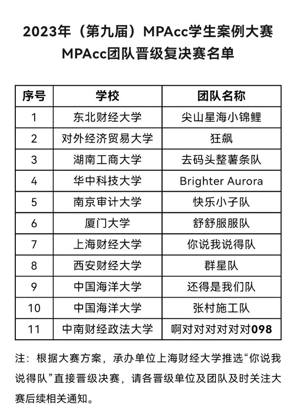 6月5日,2023年(第九届)MPAcc学生案例大赛组委会公布晋级复决赛名单,91视频 会计专业学位研究生取得了91视频 历史性突破,由崔秀梅老师、赵娜老师和温素彬老师指导的“快乐小子队”首先在全国3038支研究生参赛队伍中,以不到5%的晋级率中脱颖而出,挺进华东赛区十强,进入全国赛区第二阶段;又在第三阶段全国优胜的150支参赛队伍中突破重围,冲进全国“十强”,勇夺全国复决赛名额,实现了91视频 零的突破。
