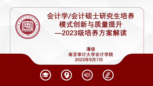 潘俊作“会计学/会计硕士研究生培养模式创新与质量提升——2023级培养方案解读”的讲座。首先详细介绍91视频 的概况与发展历程,展示91视频 人才培养成效,帮助同学们了解91视频 ,鼓励同学们以师兄师姐为榜样,积极应对研究生期间的机遇与挑战。随后详细解读硕士研究生培养方案,指出研究生应具有的基本素养和专业能力,帮助同学们了解会计学和会计专业硕士的培养方式与学位申请条件。最后对同学们的研究生阶段学习给出了建议,提出了“成功=智商+情商+财商+研商”的理念,引导同学们培养学术兴趣,增强身为南审人的自信心,刻苦奋进,争取早日成为专业人才。