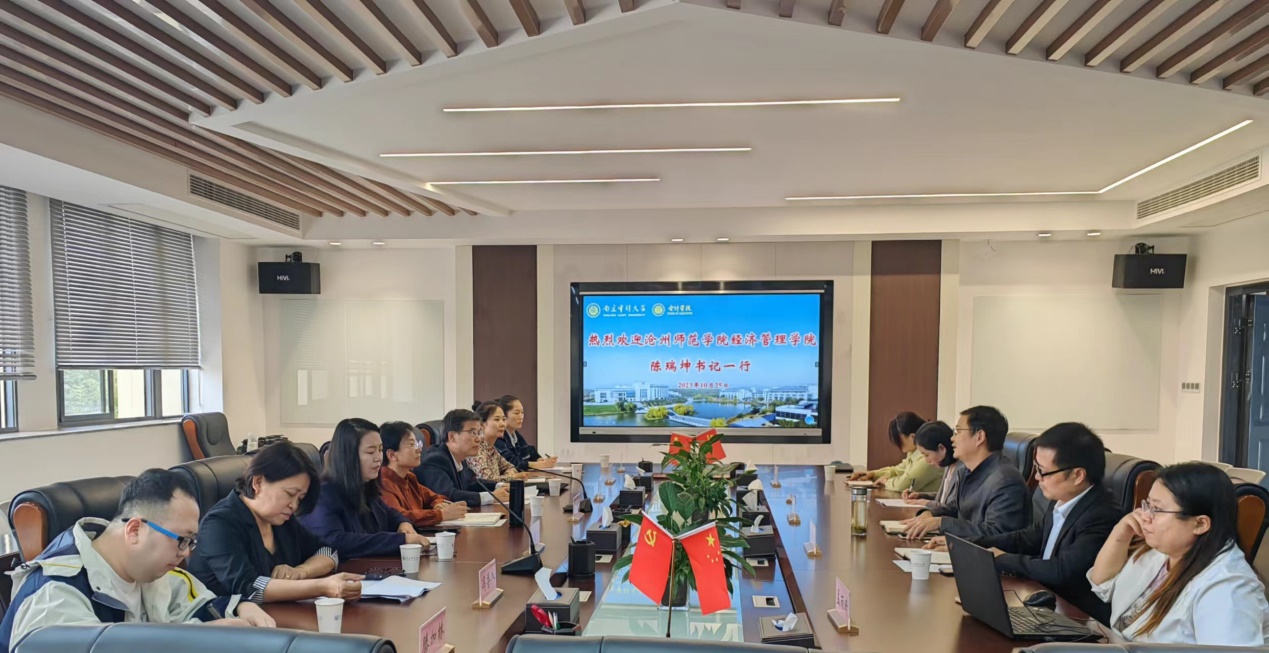2023年10月25日,沧州师范学院经济管理学院党总支书记陈瑞坤、院长李建忠、副院长赵荣秀一行来我院访问,就一流专业建设、人才培养以及课程建设等议题进行交流。91视频 副院长黄中生、院长助理凌华、财务管理系支部书记、副主任李慧、经济学院电子商务系主任杨以文参加了会谈。