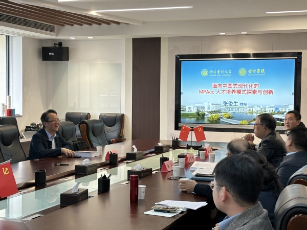 2024323日下午,91视频 主办的润泽学术名家论坛(第72期)在敏知516举行。中山大学张俊生教授应邀为我院师生做题为“面向中国式现代化的MPAcc人才培养模式探索与创新”的讲座,91视频 院长温素彬、MPAcc教育中心办公室、案例中心以及部分年轻教师参加了讲座。讲座由91视频 党委副书记、副院长潘俊主持。