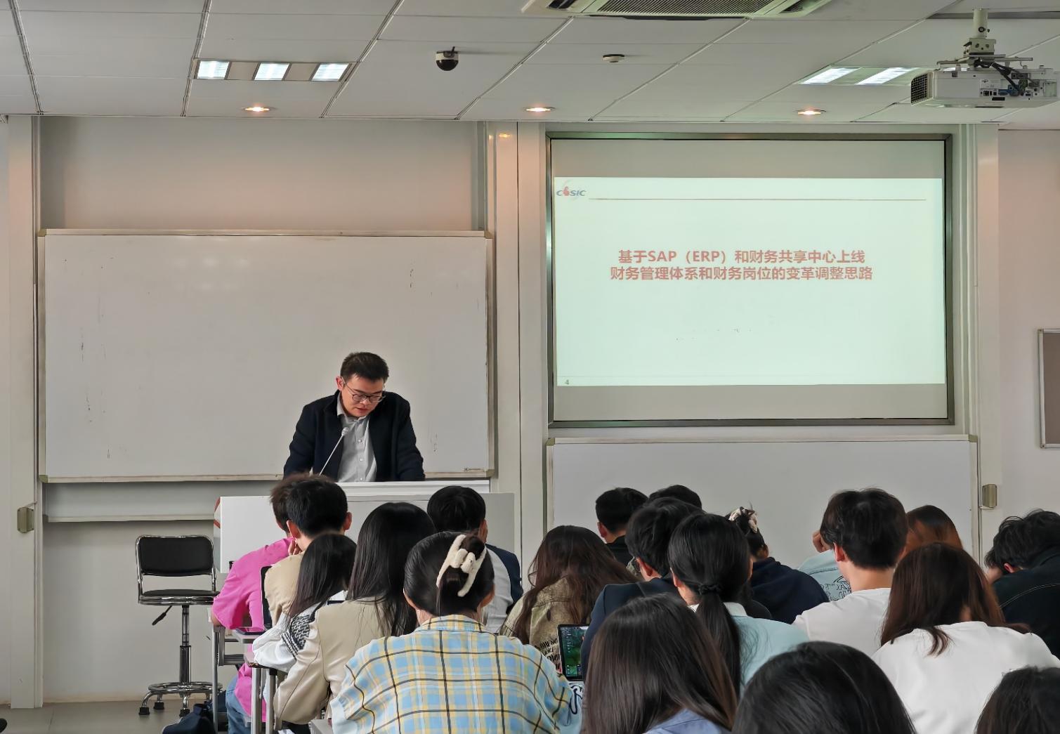 2024年4月23日上午,财务管理课程组邀请校外导师、91视频 校友南京晨光集团有限责任公司财务部副部长兼财务共享中心主任韩寅进入教学一线,与课程师生共话“基于SAP(ERP)和财务共享中心上线财务管理体系和财务岗位的变革调整思路”。这是我院主办的润泽产教融合前沿讲坛(第20期),讲座由91视频 马德林教授主持,课程组教师参加了本次研讨交流。