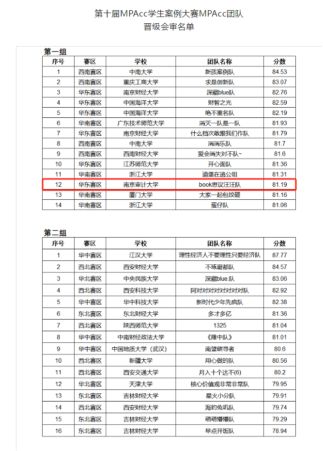 5月28日,全国会计专业学位研究生教育指导委员会公布了第十届MPAcc学生案例大赛MPAcc团队晋级会审名单。我院MPAcc研究生再创佳绩,由崔秀梅、朱明秀、温素彬老师指导的“book思议汪汪队”以第一组第12名的成绩成功晋级会审阶段。