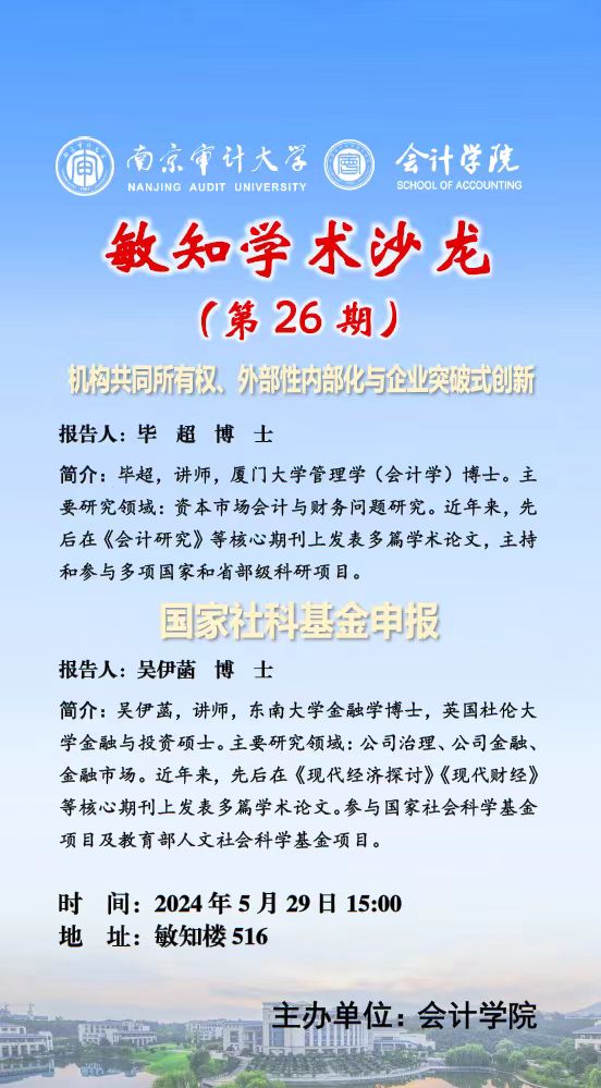 敏知学术沙龙(第 26 期) :毕超——机构共同所有权、外部性内部化与企业突破式创新,吴伊菡——国家社科基金申报