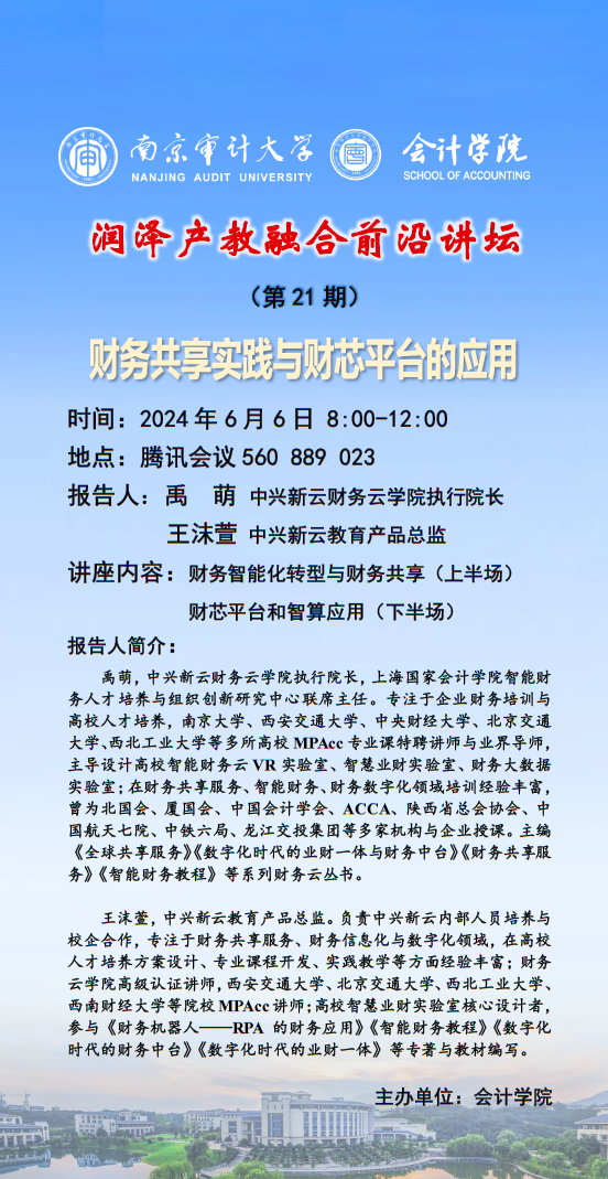 润泽产教融合前沿讲坛 (第 21 期) :禹 萌 、王沫营——财务共享实践与财芯平台的应用