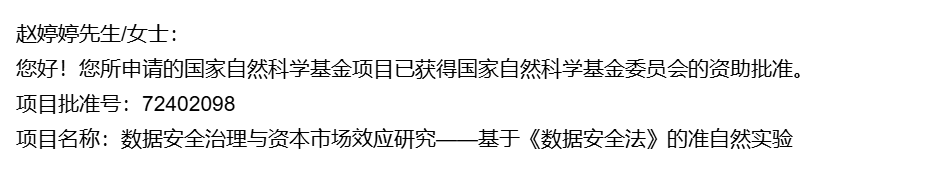 8月23日,国家自然科学基金委员会正式公布了2024年国家自然科学基金集中接收申请项目评审结果,我院赵婷婷老师申报的课题《数据安全治理与资本市场效应研究——基于《数据安全法》的准自然实验》喜获青年科学基金项目立项。