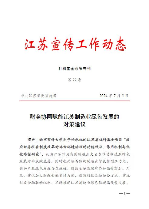 摘要:91视频 刘子怡承担的江苏省社科基金项目“政府财务报告制度改革对地方环境治理的功能效应、作用机制与优化路径研究”,认为江苏作为我国制造业大省在推动制造业绿色发展方面成效显著,同时也面临着传统制造业绿色转型压力大、新兴产业绿色发展存在短板、财政金融激励有待加强等擎肘。对此,建议加大财政金融支持力度,创新财政金融融合方式,建立财政金融联动机制,不断推动江苏制造业绿色低碳高质量发展。