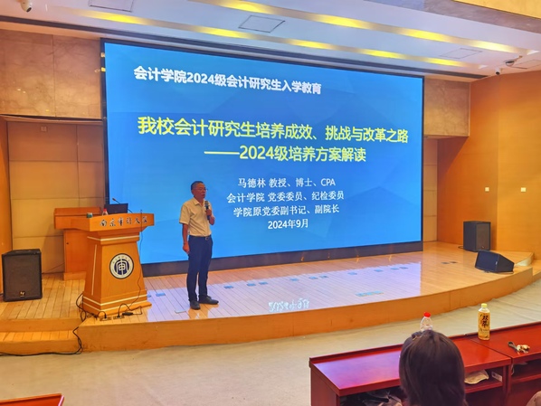 马德林首先从“审计+经济监督+国家治理”的学科总体战略布局角度,概述学校在审计、会计学科的认识、建设和演变,诠释会计学科及人才培养的目标、思路、特色与定位。接着,他回顾了研究生培养中的导师队伍、产业教授、研究生工作站、就业率、升学率、优秀学位论文获奖、专业学位案例入库、全国MPAcc案例竞赛获奖等建设情况,希望同学们认清学校、认准学院,认清自己,学习优秀榜样,明确自己未来学术发展方向与职业发展去向。最后,他带领全体研究生,解读了2024级培养方案设计特点、智能化升级、课程模板设计思路、实习实践和学位论文要求。希望同学们认真了解,多与导师、同学沟通、多选修课程,多收获成果,为自己未来发展奠定扎实基础,也为学院发展和AAPEQ认证贡献自己力量。