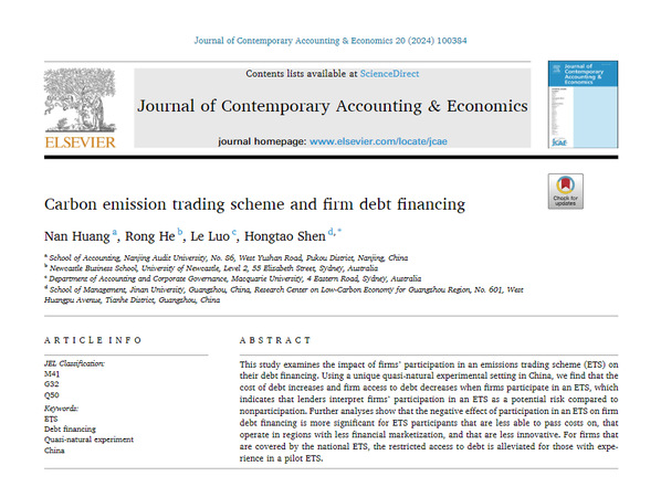 摘要:本研究考察了企业参与排放交易计划(ETS)对其债务融资的影响。利用中国独特的准自然实验环境,我们发现企业参与试点地区碳排放交易体系后,其债务融资成本增加、新增债务融资规模减少,这表明债权人将企业参与碳排放交易视为一种潜在风险。进一步的分析表明,对于成本转嫁能力较弱、创新能力较差、处于金融市场化程度较低地区的企业,ETS对其债务融资的负面影响更为显著。但是,在全国碳排放权交易实施后,对于有参与试点碳排放权交易经验的企业来说,债务融资限制有所缓解。