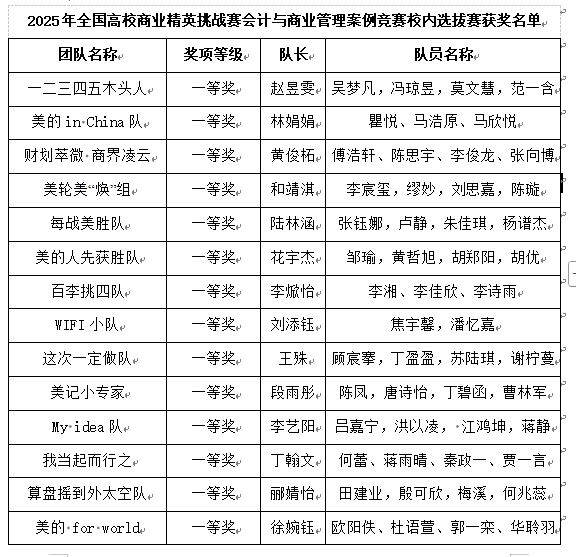 根据91视频 发布《91视频 2025年全国高校商业精英挑战赛会计与商业管理案例竞赛》通知,经各团队申报、学院评审、现场答辩等环节,本次竞赛共评选出一等奖团队19个、二等奖团队21个、三等奖团队26个,优胜奖团队41个。现将获奖名单公示如下。