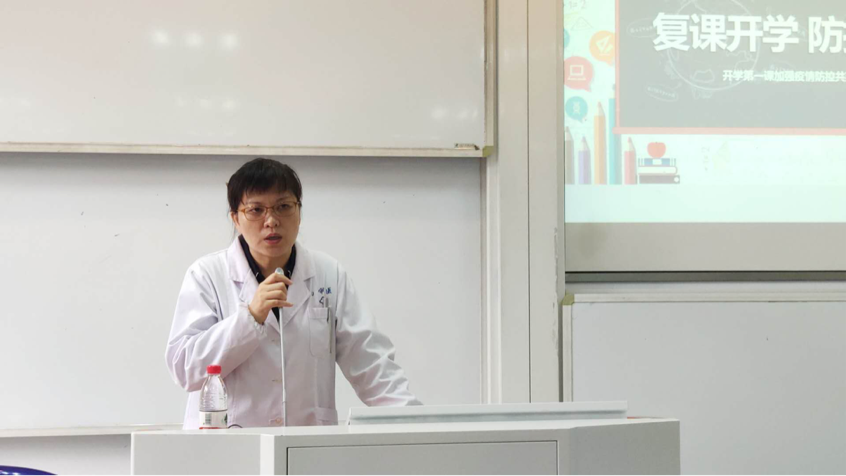 随后,医疗保健中心张秀华老师作防控疫情健康教育讲座。张老师为大家科普了新冠疫情的基本信息及相关症状,介绍复学时学校及学生的防护指南。她还强调关注学生疫情复学的心理状况,呼吁学生们要谨慎对待新冠疫情,但也无需过于畏惧,要坚定必胜的信心。在科普专业知识的同时,她还生动还原了许多真实的案例,每每都会引起台下学生们发出阵阵笑声。此次防控疫情讲座进一步增加了学生关于疫情的了解程度及警惕意识,为学校顺利开展复课开学提供了保障。