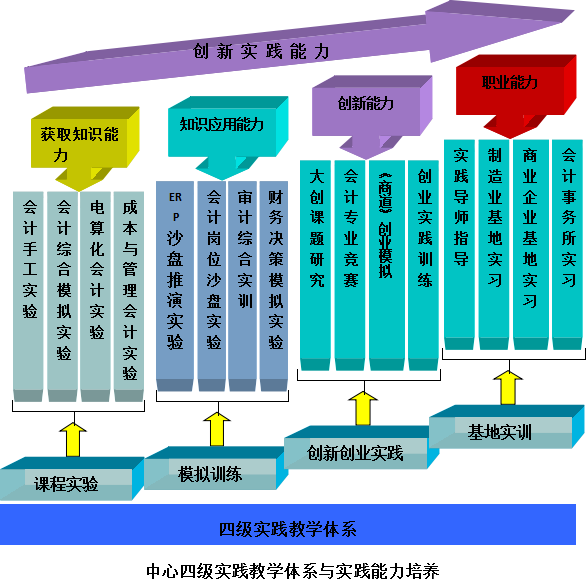 学院在设计实践教学体系的同时,充分注重了对课堂教学的辅助支撑和对学生第二课堂的推动。首先,设计了会计网络考核与评价系统,将会计的日常教学中的考核与辅导通过网络来完成,拓宽了传统的会计辅导空间与时间,实现了全天候的教学辅导与考核。其次,设计了会计对抗性的实验教学理念,陆续引入对抗性的实验教学软件,增加团队实验课程,充分训练学生的团队合作精神与创新精神。另外,还将实验教学课堂扩展到校外,带领学生参加全国行的创新竞赛,如:“创青春” “天平杯”、“用友杯”、“金蝶杯”、“商道”、“网中网财务决策”、“中华会计网校杯”、瑞华杯等全国性的专业竞赛,拓展学生的视野,增强他们的实验学习兴趣。 近三年,累计获得国家级竞赛奖项28项,省级竞赛奖项63项,获奖层次及数量逐年提高。